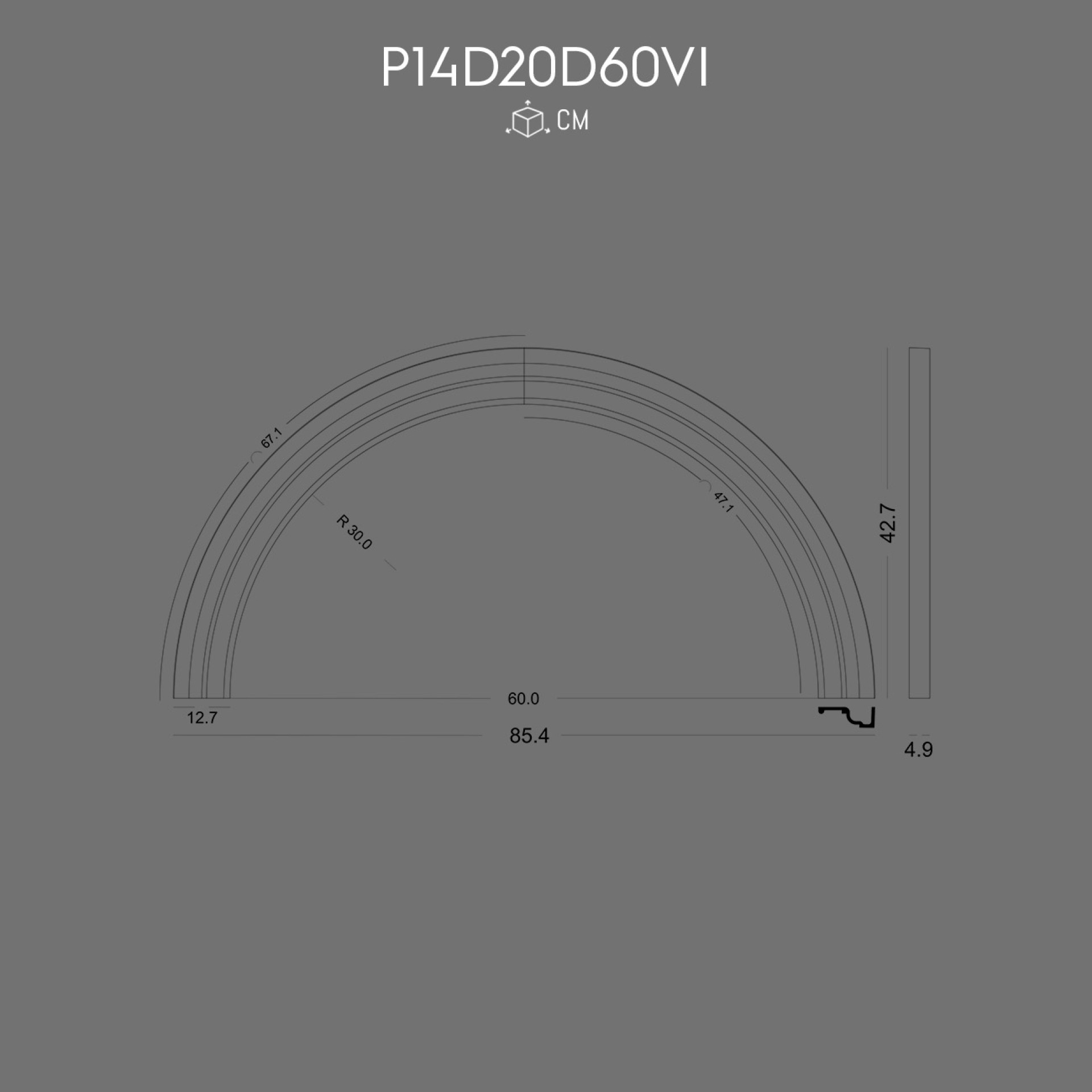 P14D25D100VI Decoratiune din poliuretan pentru margine exterior de perete cu arcada semirotunda.