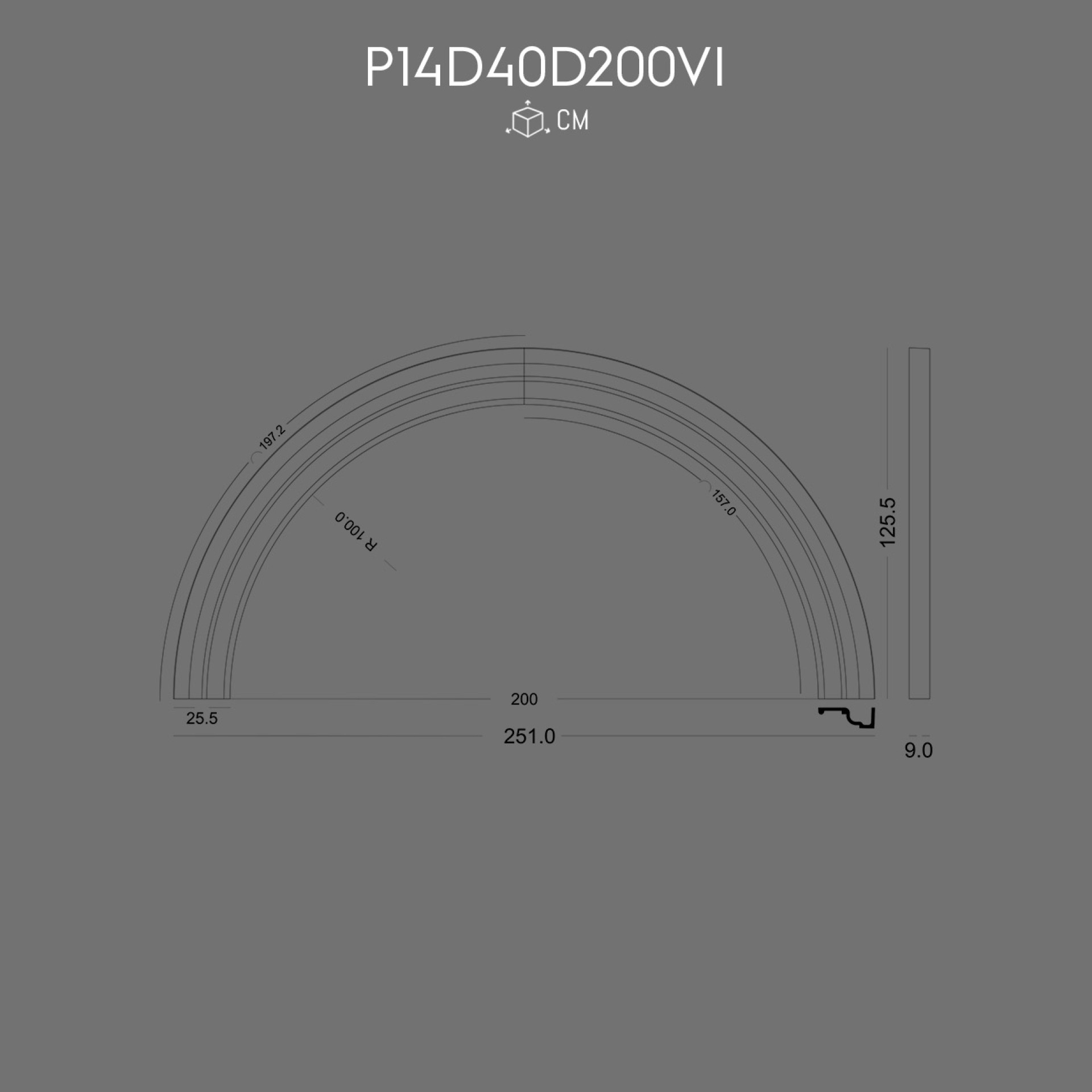 P14D25D100VI Decoratiune din poliuretan pentru margine exterior de perete cu arcada semirotunda.